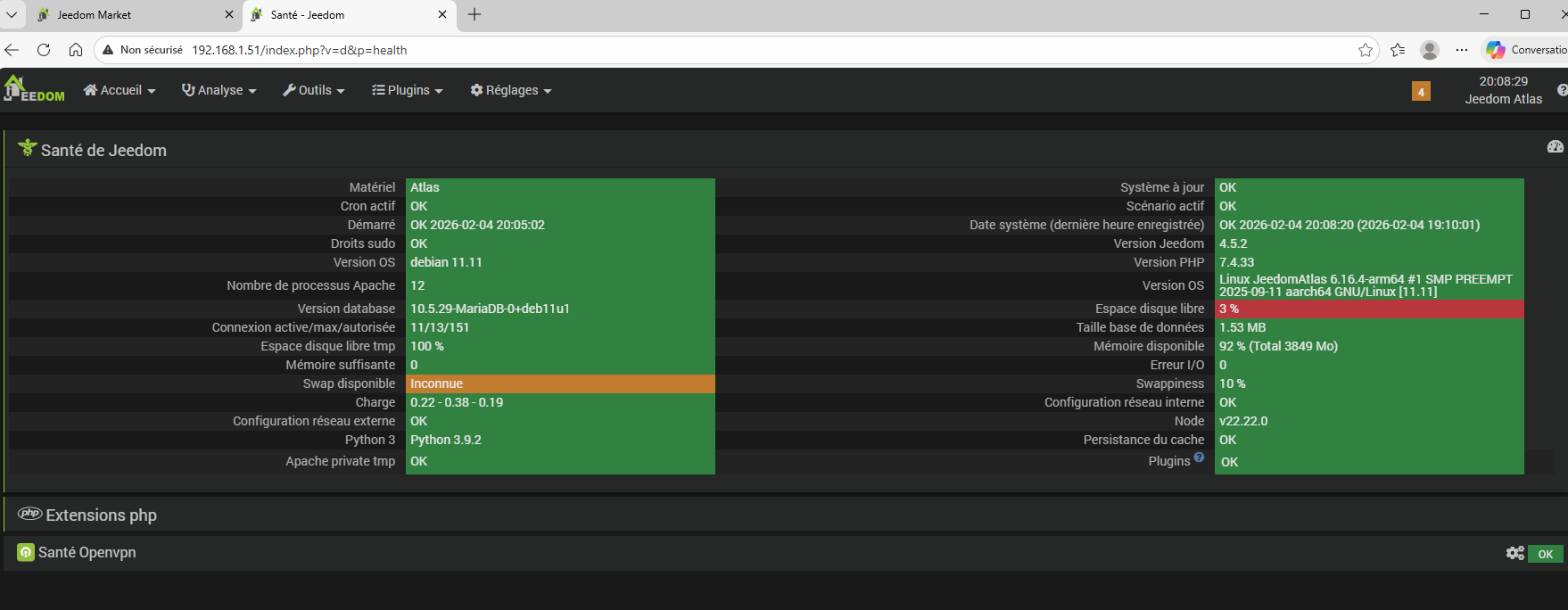 Aujourd’hui sur la page santé alors que j’ai seulement le plugin Openvpn d’installé car je n’ai pas encore restauré mon backup de ma version 4.3.16 sur la page santé, j’ai Swap disponible inconnu et mon espace disque à 3%.