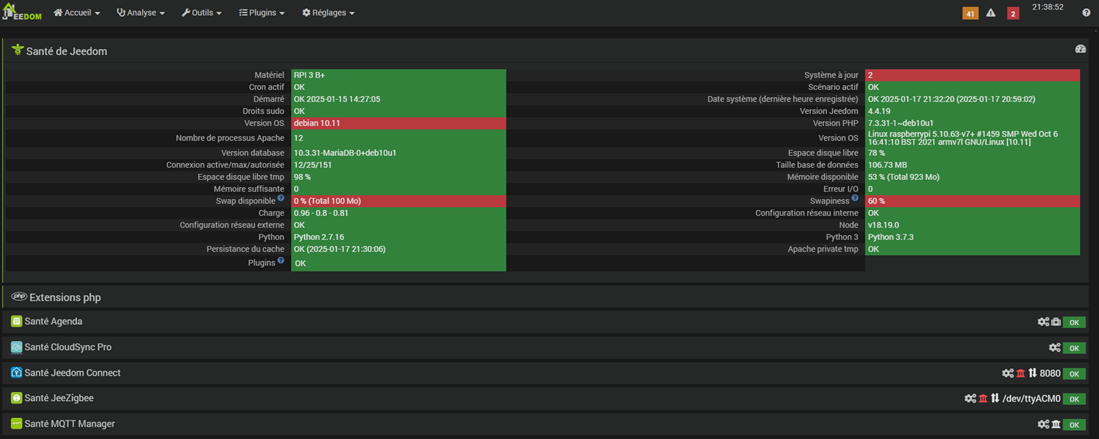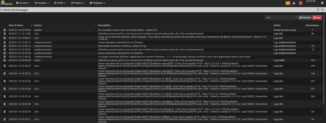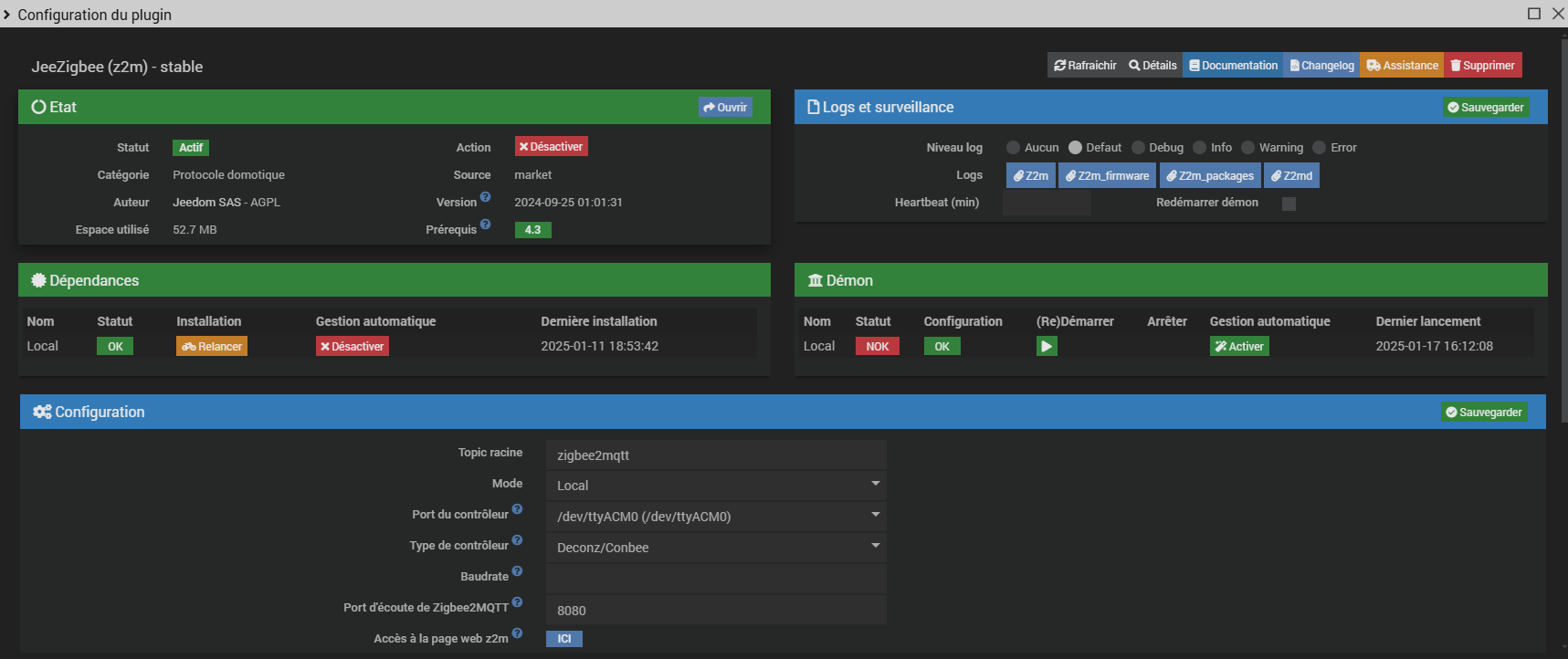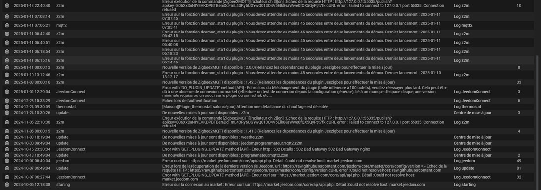 J’en arrive à ma venue ici aujourd’hui. Depuis 1 semaine plus rien ne fonctionne, les T° affichées sur les thermostats dans l’appli sont restées bloquées à la date ou jeedom a cessé de fonctionner. J’ai pensé (oui, ça m’arrive !) que cela venait des sondes (aqara). Et c’est en voulant aller voir sur la page web z2m (comme on me l’a appris il y a un an) avec l’idée de désinstaller les sondes et les (re)inclure (ça, je sais faire !) dans le système que je me suis rendu compte que je n’avais plus accès à la page web zigbee2MQTT.