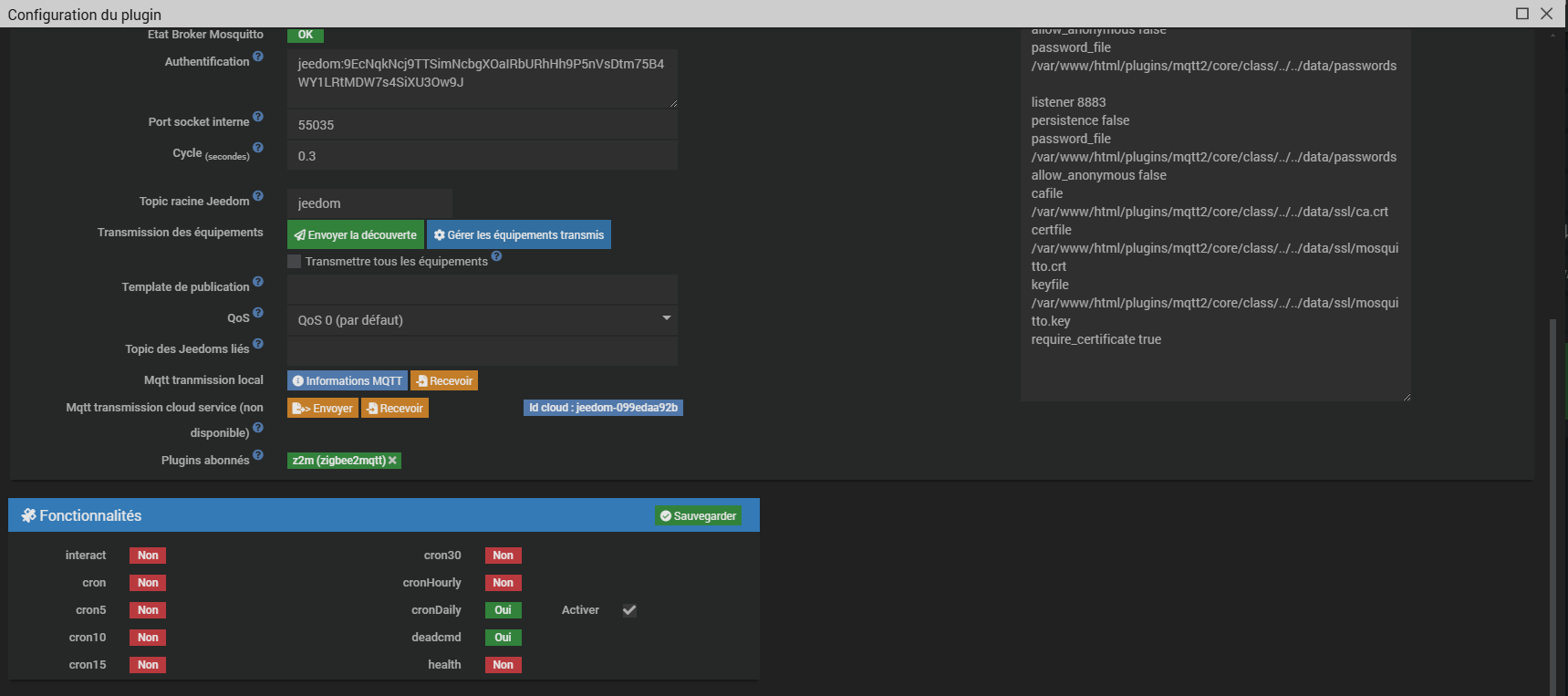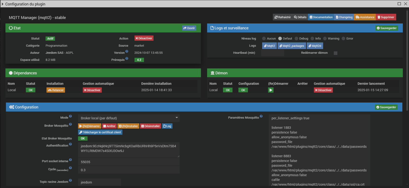 @Filvert peut tu nous faire un screenshot de la config de ton plugin Z2M (attention masque to identifiant) et nous dire en quelle version de Zigbee2MQTT. Il faut que ce soit 1.42. Dans les logs, je vois aussi qu’il semblerait que tu as un problème de connection vers to MQTT. Est-ce un clef distante que tu utilise? Dans mon cas j’ai un SLZB avec une adresse IP fixe pour eviter que l’adresse change en cas de coupure de courant.