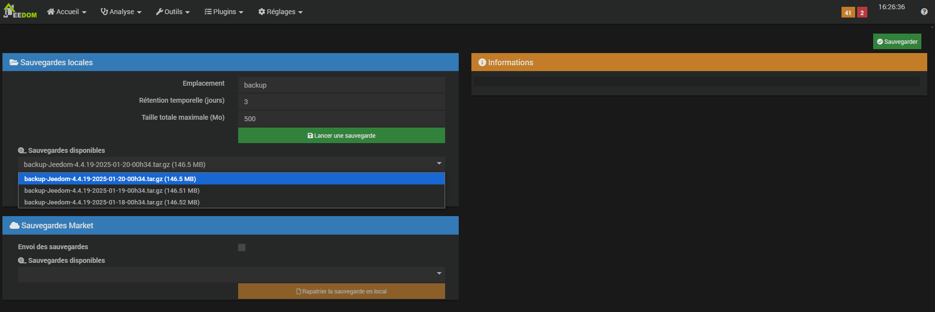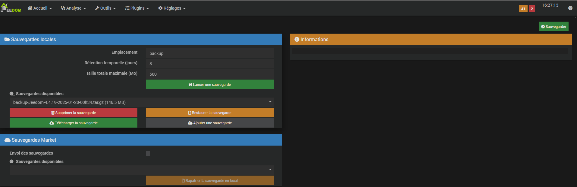 @Filvert est ce que vous savez si votre jeedom est configuré pour faire des sauvegardes régulièrement ? (Il faut aller voir dans le Menu Système/Sauvegardes)