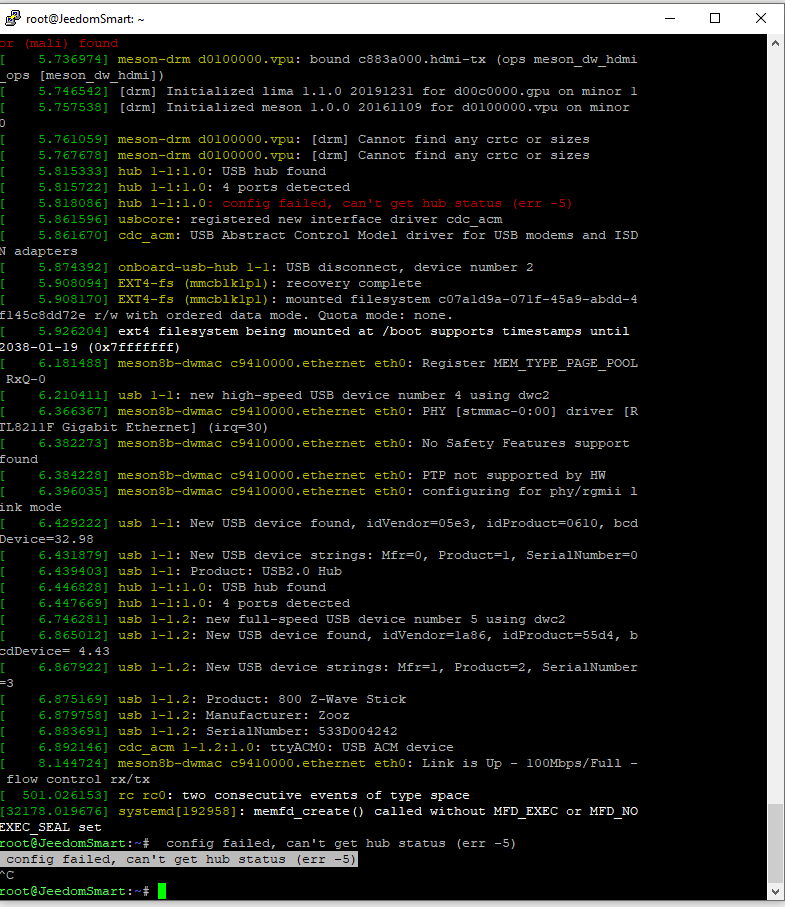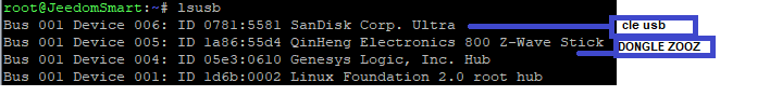 Bonjour. Par la commande lsusb (en SSH) je vois mon dongle ZOOZ 800 zst39 et la clé USB connectée pour test. par la commande dmesg un défaut de configuration apparait (status err-5) mais ne me parle pas. Peut être pourrez vous me mettre sur une piste.