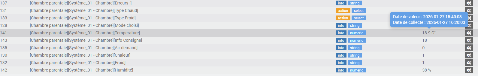 0002|[2026-01-28 11:36:13] INFO ||┌── Données recues {"data":[{"systemID":1,"zoneID":2,"name":"Chambre","thermos_type":2,"thermos_firmware":"3.52","thermos_radio":0,"on":0,"double_sp":0,"coolsetpoint":18,"coolmaxtemp":30,"coolmintemp":15,"heatsetpoint":18,"heatmaxtemp":30,"heatmintemp":15,"maxTemp":30,"minTemp":15,"setpoint":18,"roomTemp":19.1,"sleep":0,"temp_step":0.5,"modes":[1,4,2,3,5],"mode":3,"speed":0,"coldStage":1,"heatStage":1,"coldStages":1,"heatStages":1,"humidity":47,"units":0,"errors":[],"air_demand":0,"floor_demand":0,"cold_demand":0,"heat_demand":0,"aq_mode":2,"aq_quality":0,"aq_thrlow":25,"aq_thrhigh":50,"heatangle":0,"coldangle":0,"master_zoneID":2,"eco_adapt":"off","antifreeze":1}]} ──
