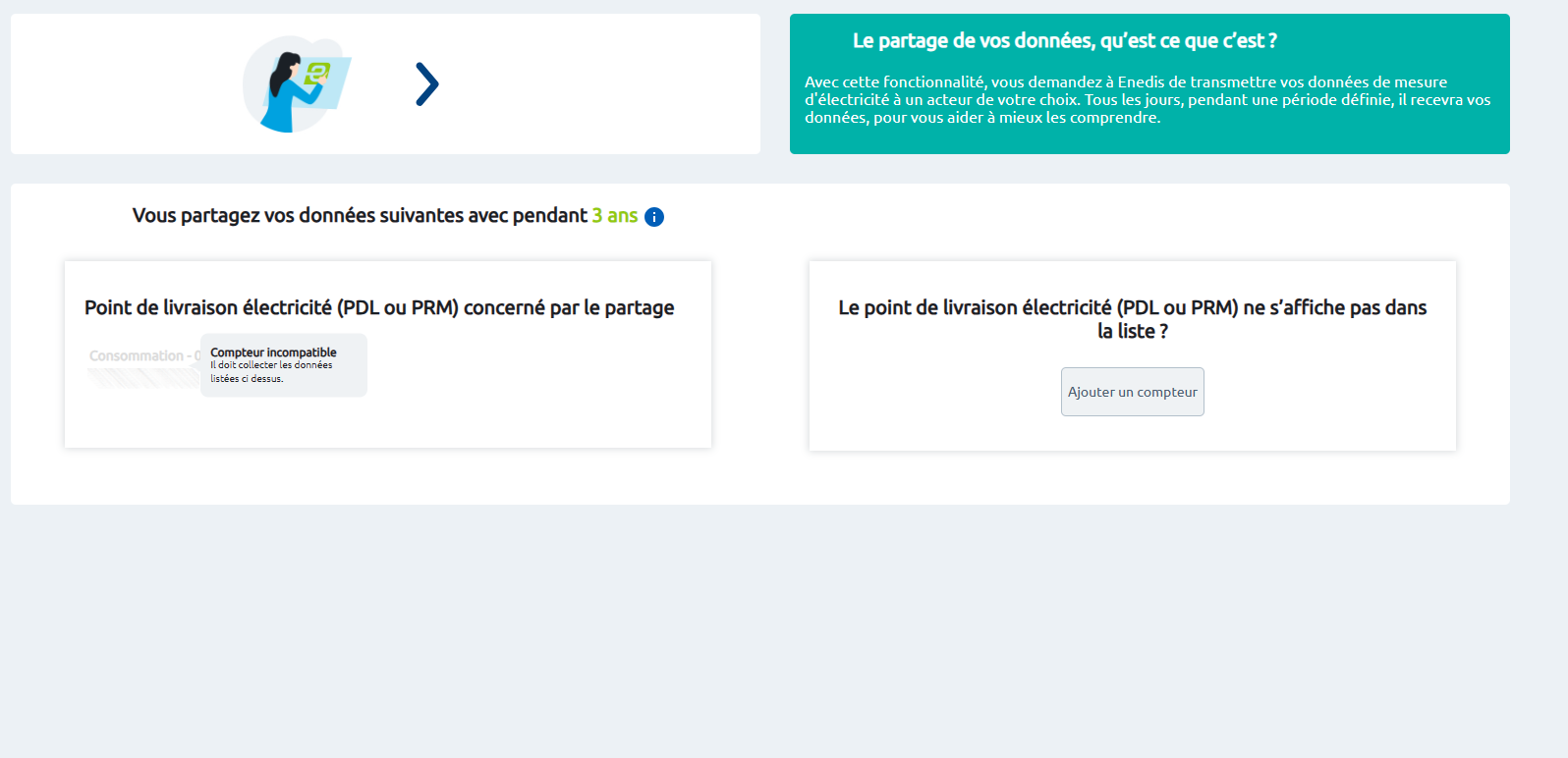 La fonctionnalité d’autorisation du partage des données est toujours indiquée comme étant indisponible, je pense que la mention « Compteur incompatible » vient de là car quand je teste à nouveau j’ai la même chose de mon côté sans affichage du bouton de validation en dessous :