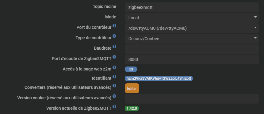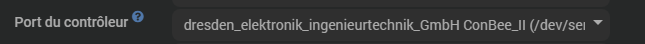 Alors le port pour le controleur, tu dois pouvoir utiliser le by-id si c’est bien une clé usb. C’est plus sur.