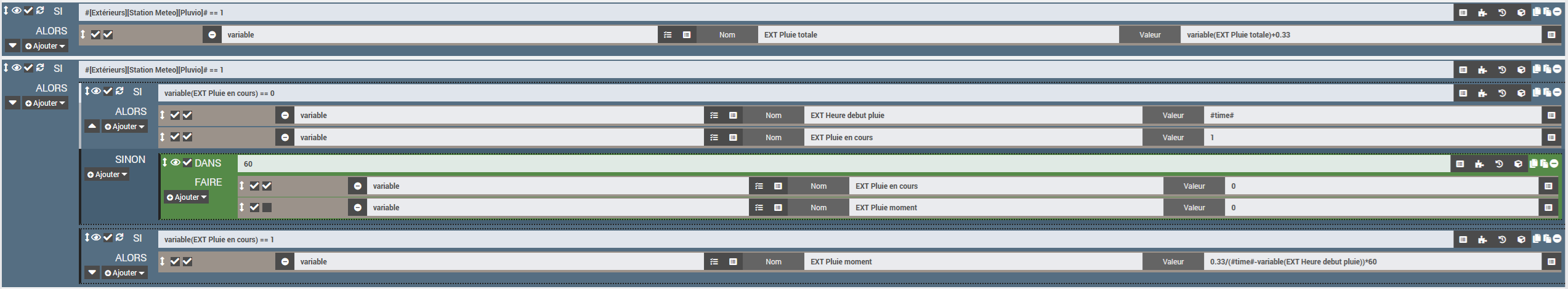 Pour avoir pluie moment perso j’enregistrerai le datetime de l’établissement du contact par un scénario, à la 2eme bascule je calculerai le débit à la seconde (volume d’une bascule divisé par le nombre de secondes écoulées). Comma ça tu auras nb litres à la seconde puis tu multiplies par 60 et tu l’as à la minute que tu remultiplies par 60 et là tu l’as à l’heure