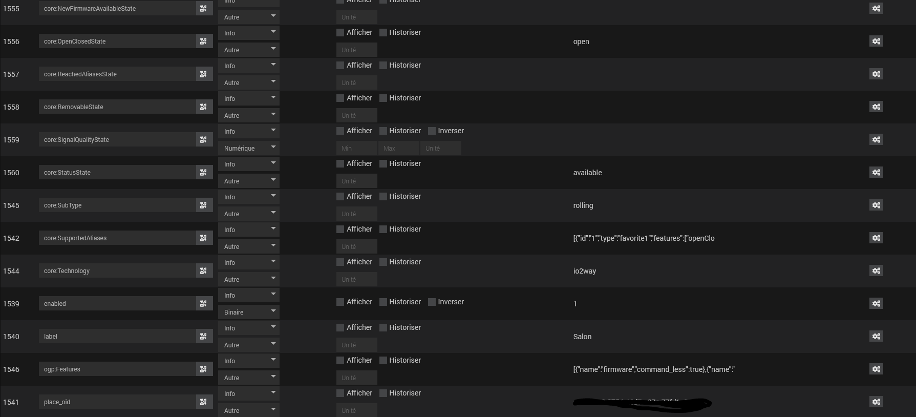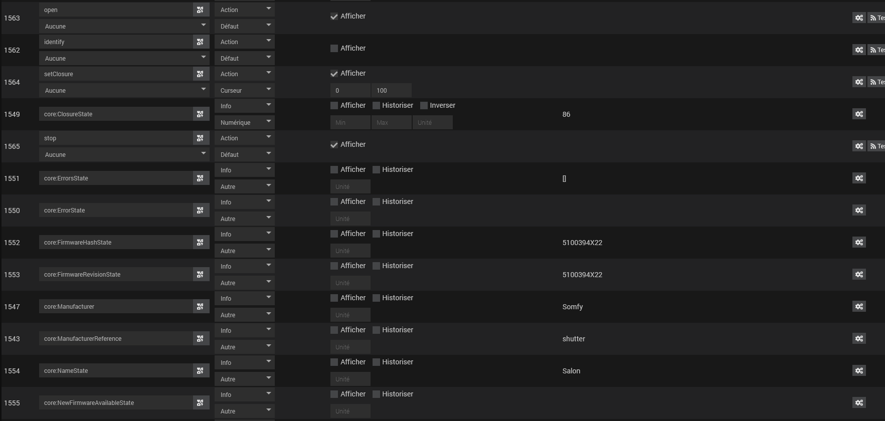 Vous dites que ce sont des volets Somfy mais pouvez vous me donner également les valeurs suivantes que vous trouverez dans la page de configuration de votre équipement: