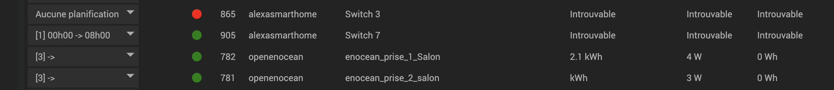 Tu pourrais mettre un seul équipement enocean dans la planification 3 (qu’il soit seul) puis exécuter manuellement la commande Planification 3 Off de l’équipement Energy Saver puis me donner les logs et ce que tu as pour cet équipement dans « Liste des équipements compatibles »