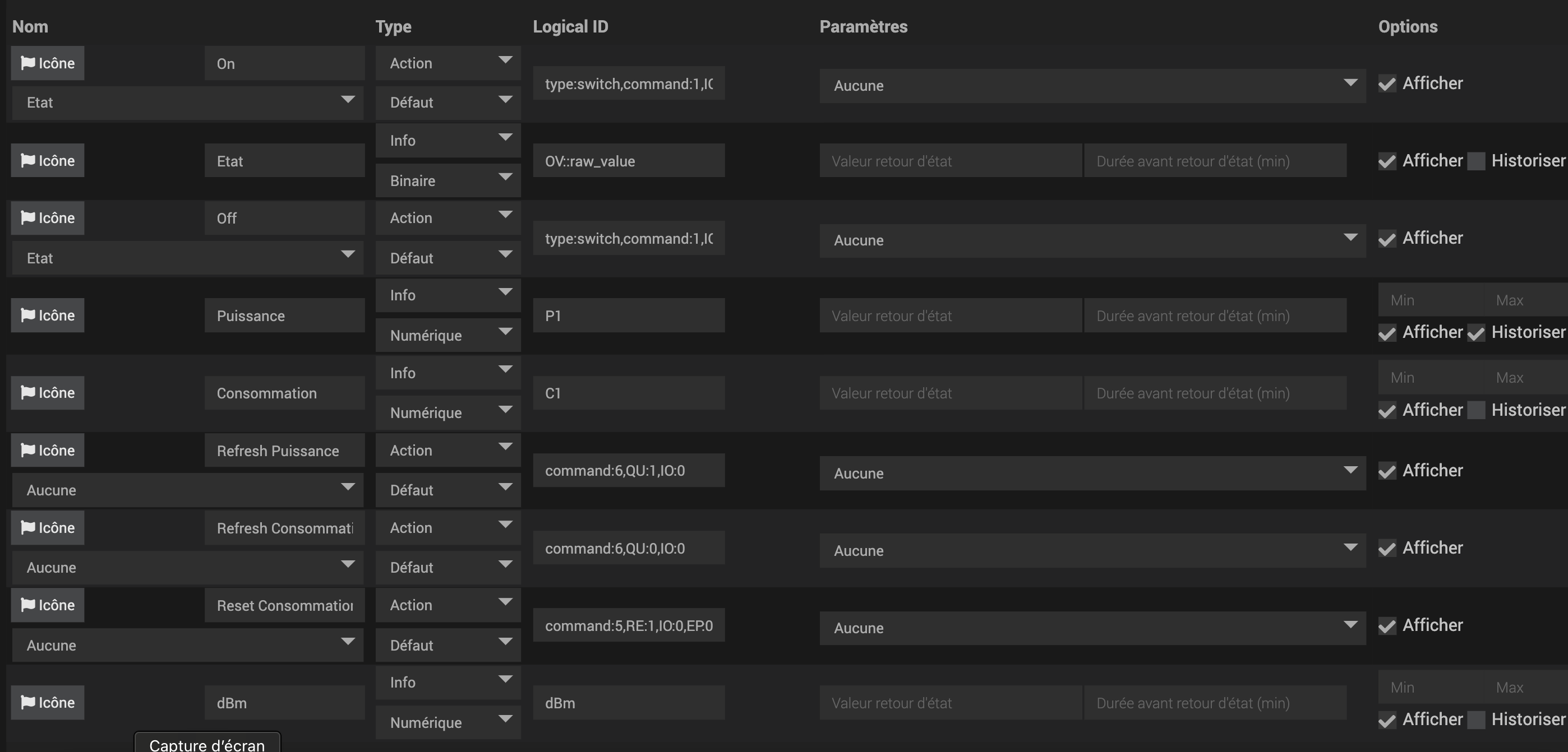 Tu peux faire une capture ce ce que ça donne dans la liste et me montrer les commandes de cet équipement dans Jeedom stp ?