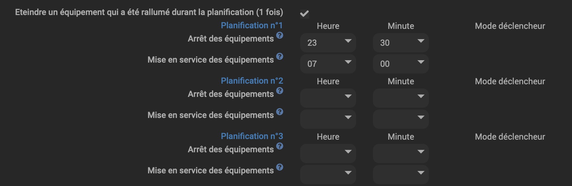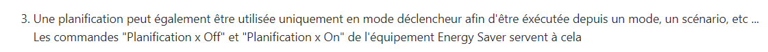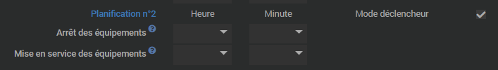 Il faut éviter de mélanger les 2 donc si tu comptes utiliser le mode déclencheur, coche le sur la planification souhaitée dans la configuration générale puis utilise les commandes adéquates pour déclencher Off et On