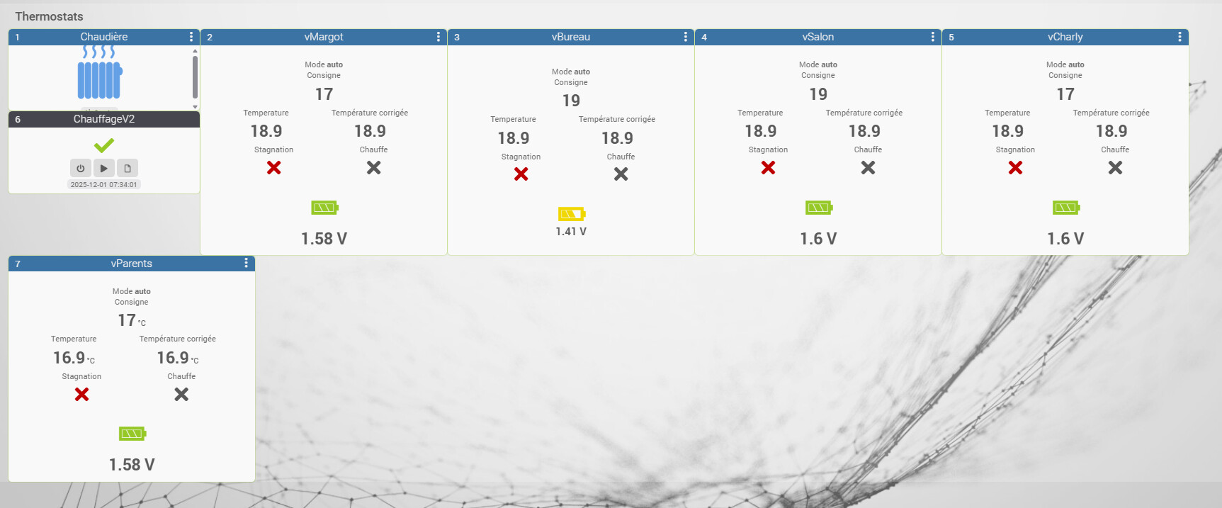 J’ai aussi une gestion de la stagnation : mes tetes ferment trop la valve a l’approche de la consigne, du coup des fois j’ai du mal a l’atteindre, donc j’ai une commande qui passe a 1 si ca a pas bougé depuis 30 minute. Si cette commande est a 1, mon virtuel ne demande pas de chauffe.