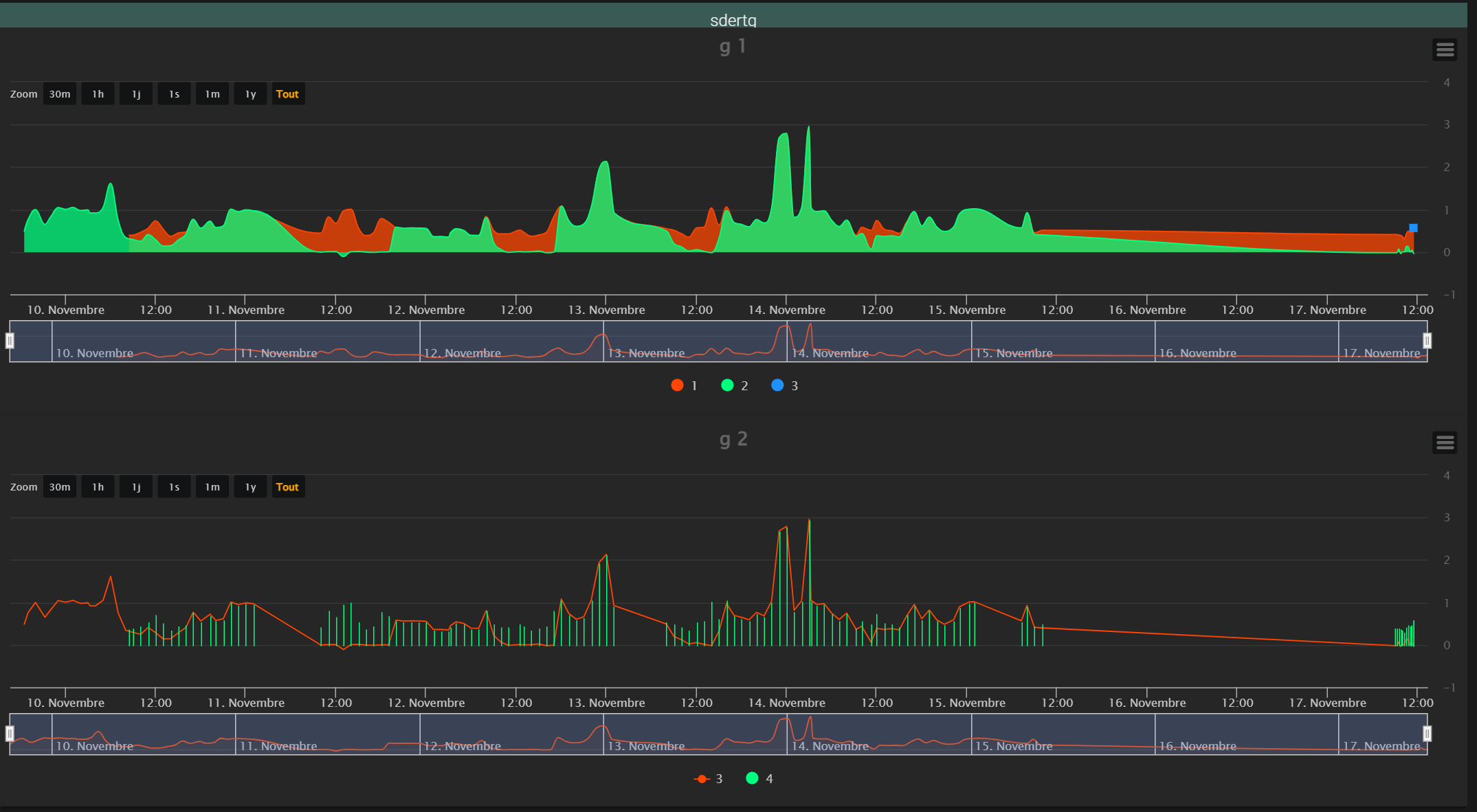 - 4 graphiques avec 2 courbes sur chaque, période de 5 jours avec zoom sur 1 heure