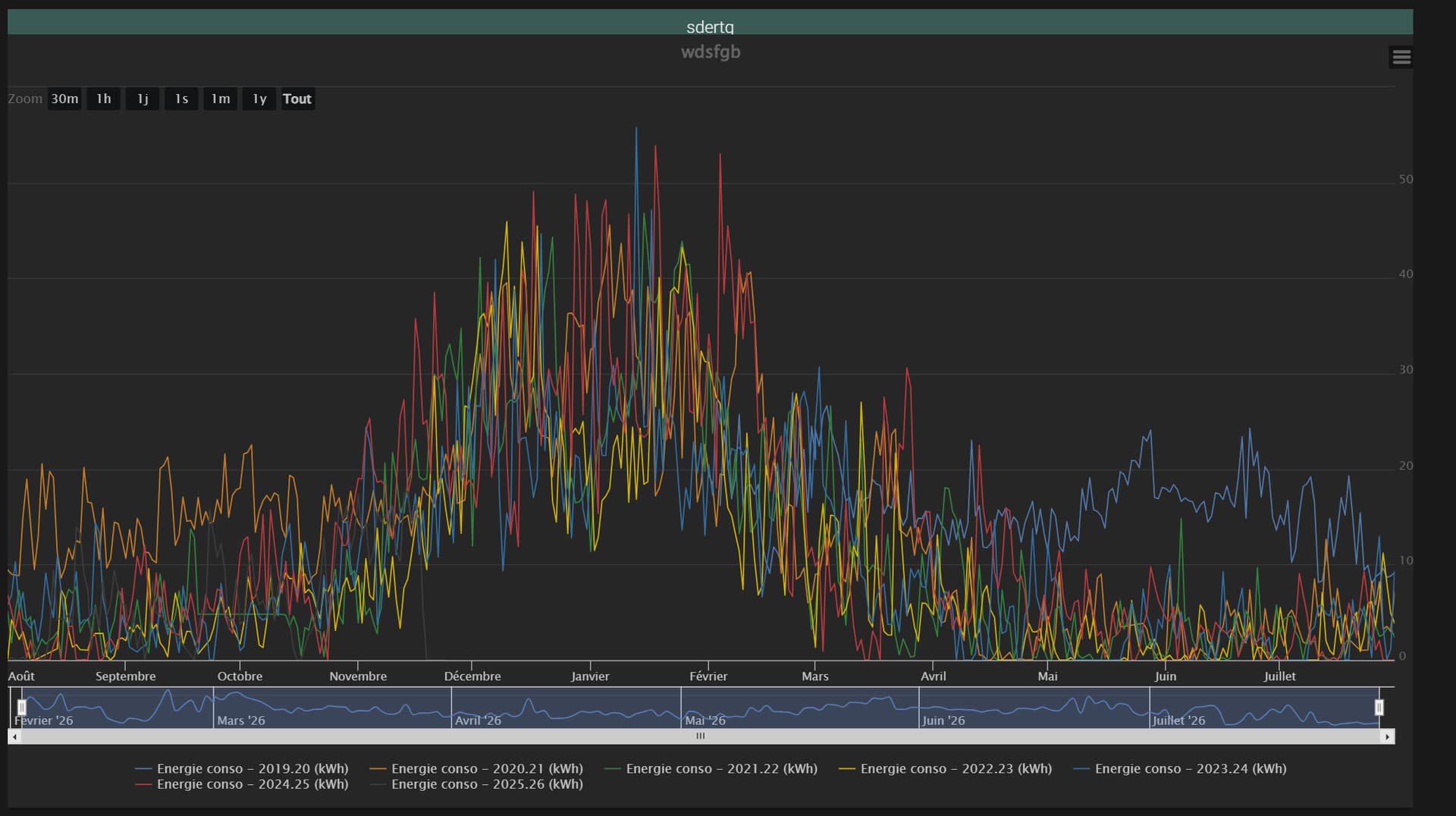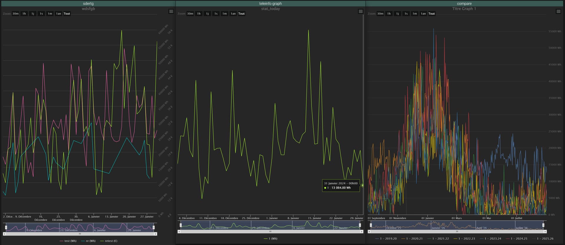 Ajout de la possibilité de comparer des données d’une seules commande pour l’instant sur plusieurs années. J’ai encore qq trucs à finaliser mais comme je ne serai pas dispo avant jeudi je préfère vous permettre de voir ce que ça donne et comme ça vous pourrez me remonter d’éventuels problème (j’en connais déjà qq uns, par exemple pour l’instant cela donne de bons résultats avec 1 seul graphique par équipement, ça, ça va être facile à régler