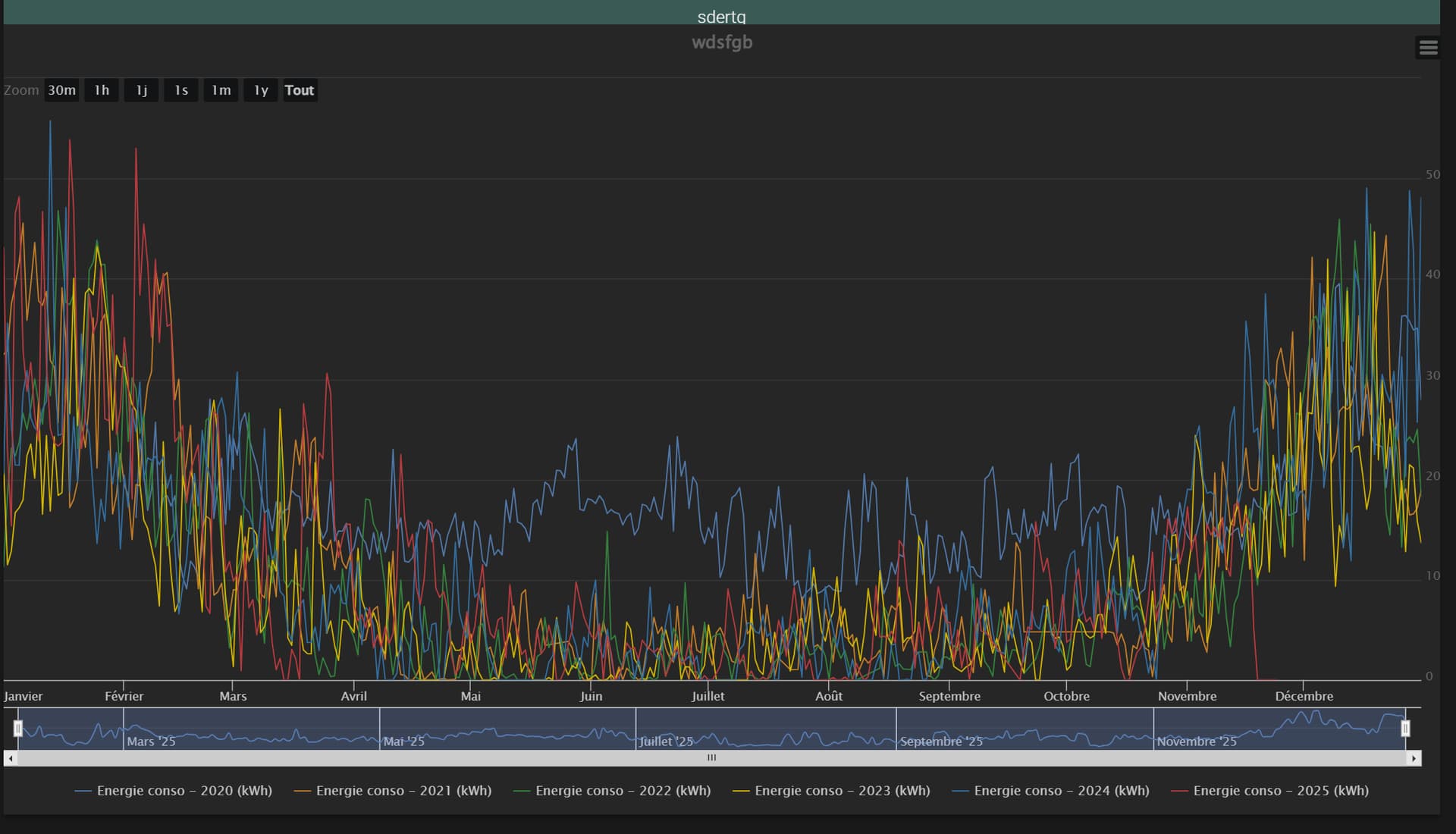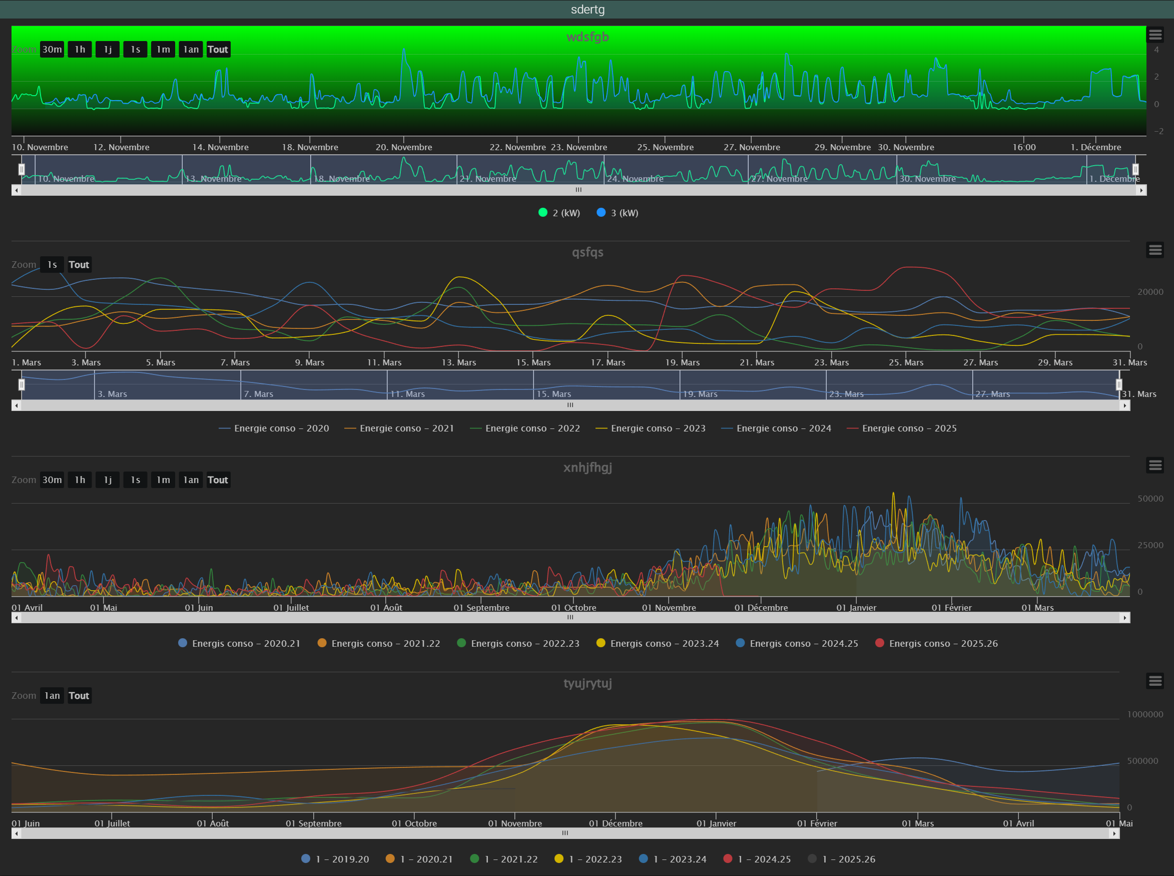 Voici ce que cela peut donner pour un équipement avec 4 graphiques affichés sur une seule colonne, le 1er graphique avec 2 courbes, le 2ème avec une seule courbe et comparaison du mois de mars de chaque année, le 3ème 1 seule courbe avec comparaison de chaque année en débutant les courbes au mois d’avril et le 4ème 1 seule courbe comparaison des années à partir de juin et avec un regroupement par mois en faisant la somme des valeurs de ce mois: