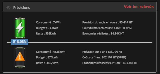 Depuis le 1/07 j’ai un an de chiffre sur ma consommation d’électricité, l’affichage des prévisions sur le mois sont ok mais sur l’année est négative elle affiche 518.08% lorsque je met la souris sur la pile du bas