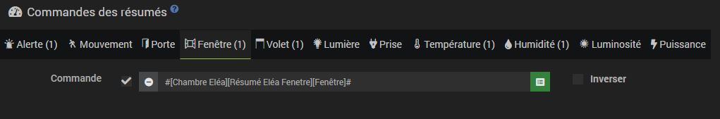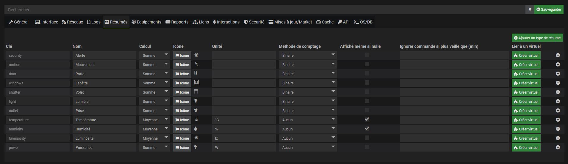 J’ai fait attention que les logical ID de mes commandes soient en rapport avec ce qui est configuré dans la configuration de Jeedom sur la partie Résumé.