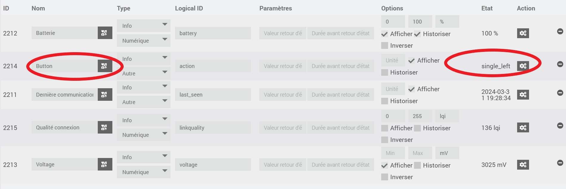 je viens de migrer du plugin zigbee à jeezigbee. pour le moment , quasi tout fonctionne . par contre , j’ai voulu inclure un interrupteur AQARA WRS-R02 mais j’ai un souci car il n’y pas de bouton 1 et 2 dans les commandes. il y a bien la ligne « button » qui m’indique bien single left et single right lorsque j’appuie sur les bouton respectif de l’interrupteur , mais comment inclure un bouton dans un scenario pour faire un va et vient ?