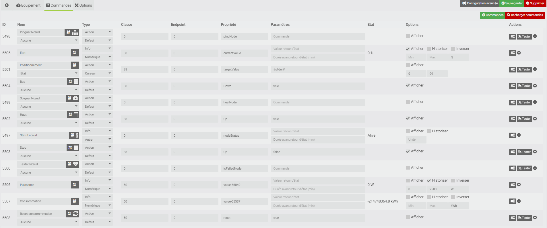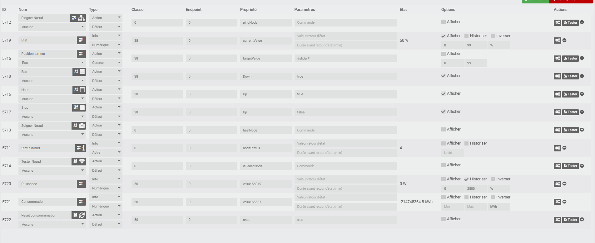 Je viens de vérifier les commandes mais je ne trouve rien de suspect en terme d’espace ou de double espace. par contre dans la valeur statut noeud et consommation c’est différent d’un volet qui fonctionne parfaitement en virtuel voici l’exemple :