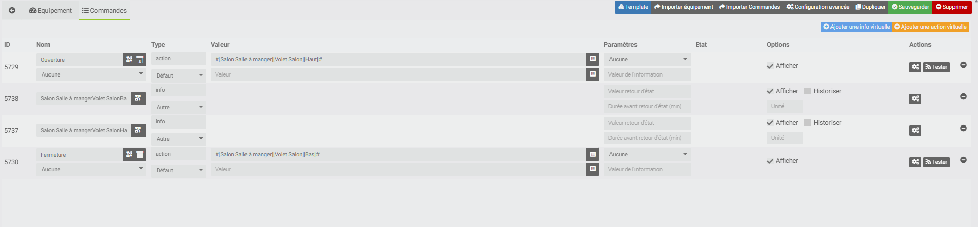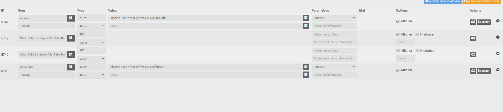 Hello tout le monde, je n’arrive toujours pas à trouve mon problème en créant un virtuel avec juste les commandes de pour monter et descendre mon volet ça ne fonctionne pas je reprends exactement les commandes de mon module Qubino mais rien ne se passe, quand je monte une info état sur mon virtuel en reprenant la commande état de mon Qubino il ne récupère pas l’info alors que ça fonctionne bien sur mon module. Je ne comprends pas d’où ça peut venir, tout fonctionnait parfaitement avant la migration vers zwavejs. Merci de votre aide.