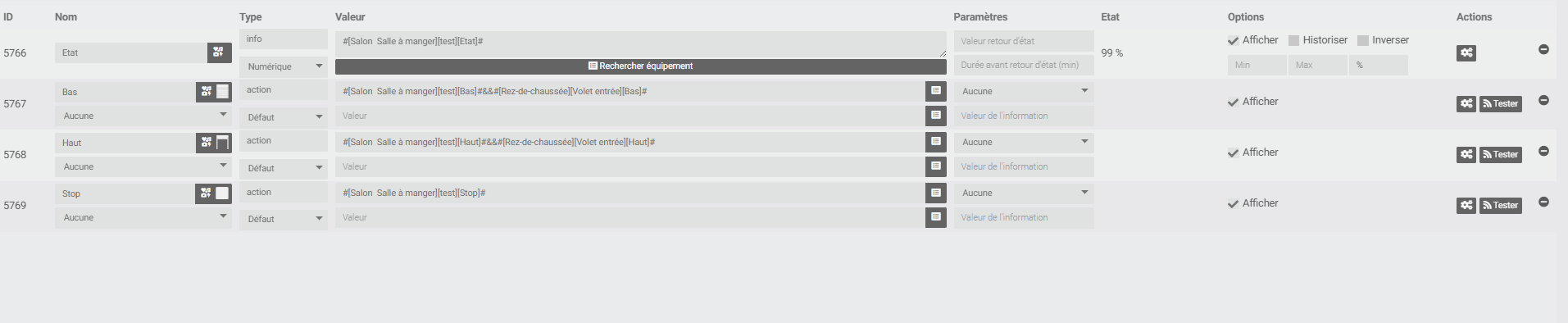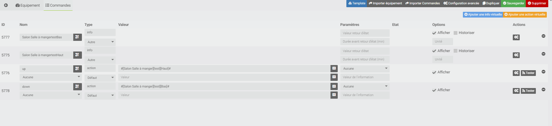 Je viens de créer un nouveau virtuel mais dès que j’ajoute les commandes haut et bas de ce volet ça m’ajoute automatique les id 5777 et 5775 en info comme ci-dessous, par contre avec un autre volet je ne rencontre pas ce problème.