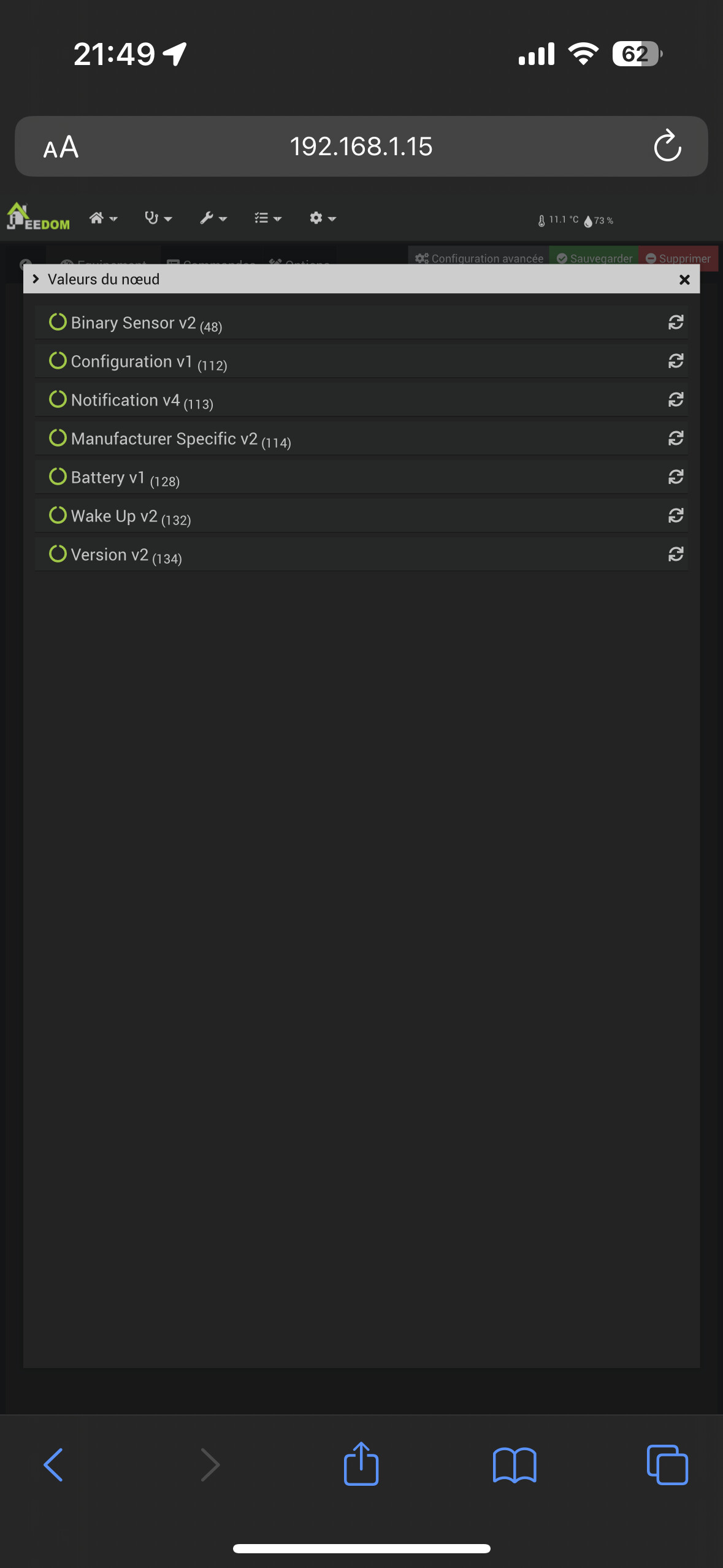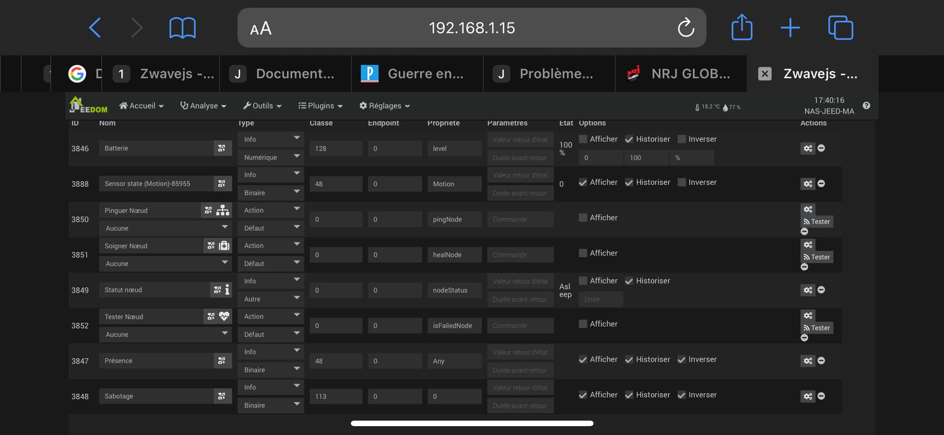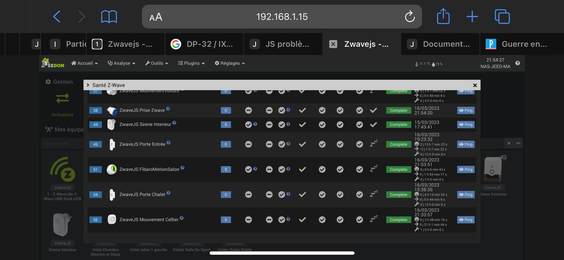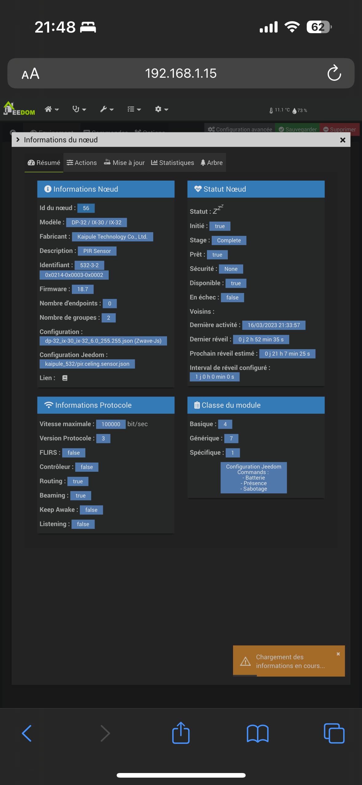 0386|[2023-03-15 17:53:26]DEBUG : [createEqLogic] Création d\'un équipement {"id":56,"inited":true,"status":2,"isControllerNode":false,"interviewStage":5,"deviceClass":{"basic":"Routing Slave","generic":"Notification Sensor","specific":"Notification Sensor","mandatorySupportedCCs":[],"mandatoryControlCCs":[]},"zwavePlusVersion":1,"ready":true,"zwavePlusRoleType":6,"isListening":false,"isFrequentListening":false,"canSleep":true,"isRouting":true,"supportedDataRates":[40000,100000],"maxDataRate":100000,"supportsSecurity":false,"isSecure":false,"supportsBeaming":true,"protocolVersion":3,"firmwareVersion":"18.7","manufacturerId":532,"manufacturer":"Kaipule Technology Co., Ltd.","productId":2,"productDescription":"PIR Sensor","productType":3,"productLabel":"DP-32 \/ IX-30 \/ IX-32","deviceDatabaseUrl":"https:\/\/devices.zwave-js.io\/?jumpTo=0x0214:0x0003:0x0002:18.7","keepAwake":false}