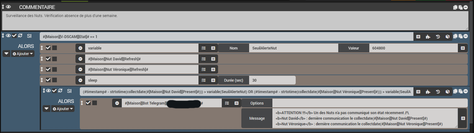 ben disons que j’ai pu constater avec regrets que la remontée des niveaux de batteries n’est pas très efficace (bcp d’appareils zigbee ne remontent pas correctement les piles, notamment les NUT et certains capteurs)… avec ce scenario je vais un peu plus loin que la simple vérification du niveau de pile mais de la continuité du dialogue avec les appareils, et puis je peux gérer des alertes par mail (ou par telegram dans mon cas)