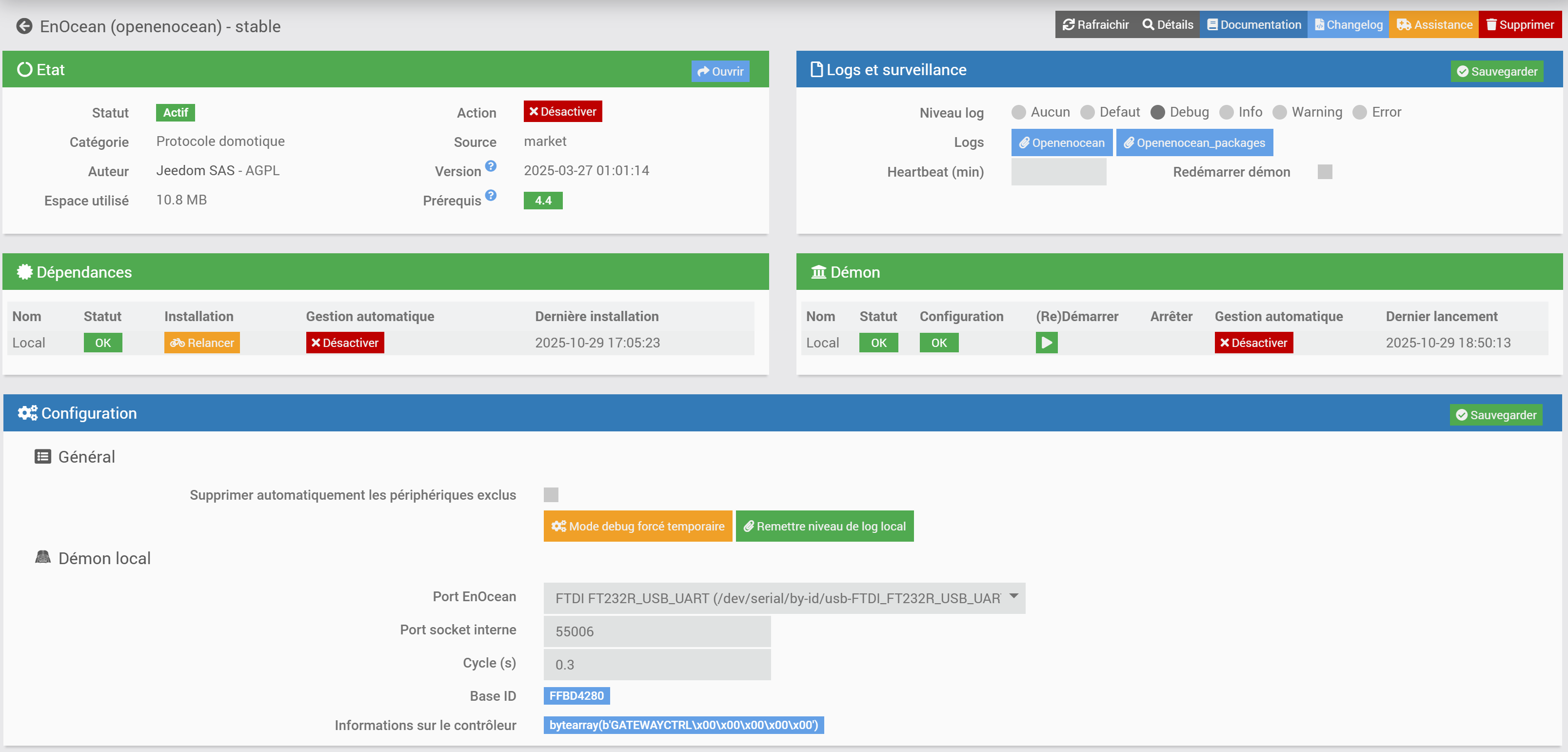 0731|[2025-10-29 18:50:15] INFO : Lancement démon openenocean : sudo python3 /var/www/html/plugins/openenocean/resources/openenoceand/openenoceand.py --device /dev/serial/by-id/usb-FTDI_FT232R_USB_UART_B40165Y5-if00-port0 --loglevel debug --socketport 55006 --callback http://127.0.0.1:80/plugins/openenocean/core/php/jeeOpenEnOcean.php --apikey M8xuAjO8VF5qBb07L8wgmA19pyp49VfAHiXXvZ1XGmuGwwakAnYh0F2rn3CvpJYr --cycle 0.3 --pid /tmp/jeedom/openenocean/deamon.pid