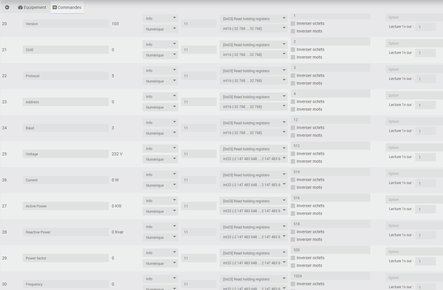 Une chose m’intrigue. Pour l’information Voltage, j’ai réussi à la récupérer en passant par l’adresse Modbus 512, alors que si on converti la valeur 2000 en Hexa, ça donnerai 8192 en décimal. En retirant 1 zéro de la valeur Hexa, on tombe sur 512 en décimal et ça me retourne bien la valeur indiquée sur l’afficheur du compteur d’énergie.