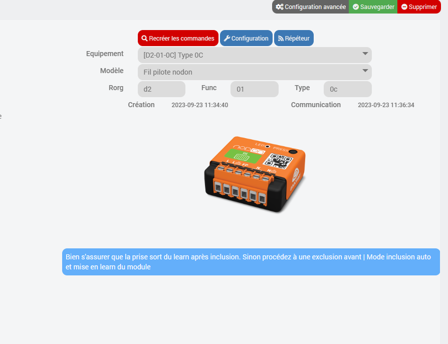 je bloque sur un problème d’utilisation avec nodon sin-2-pf-00 , je dois louper un truc je n’arrive pas a contrôler mon radiateur avec , je le retrouve bien dans jeedom , les commandes sont bien crées mais impossibles d’interagir avec