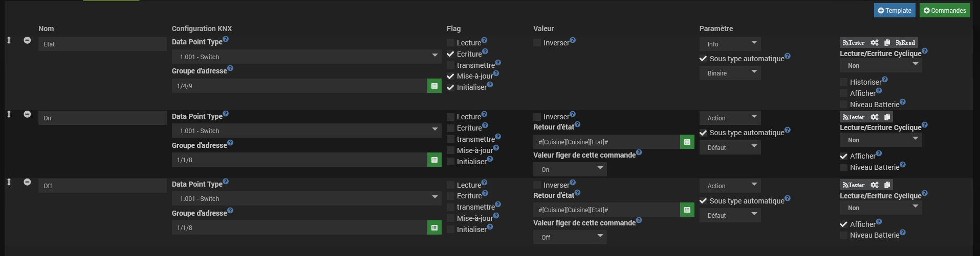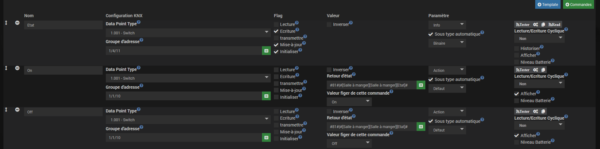 Certain on bien le nom de la commande à effectuer au-dessus de leur état (On ou Off) , par contre d’autres ont simplement « Etat » indiqué.