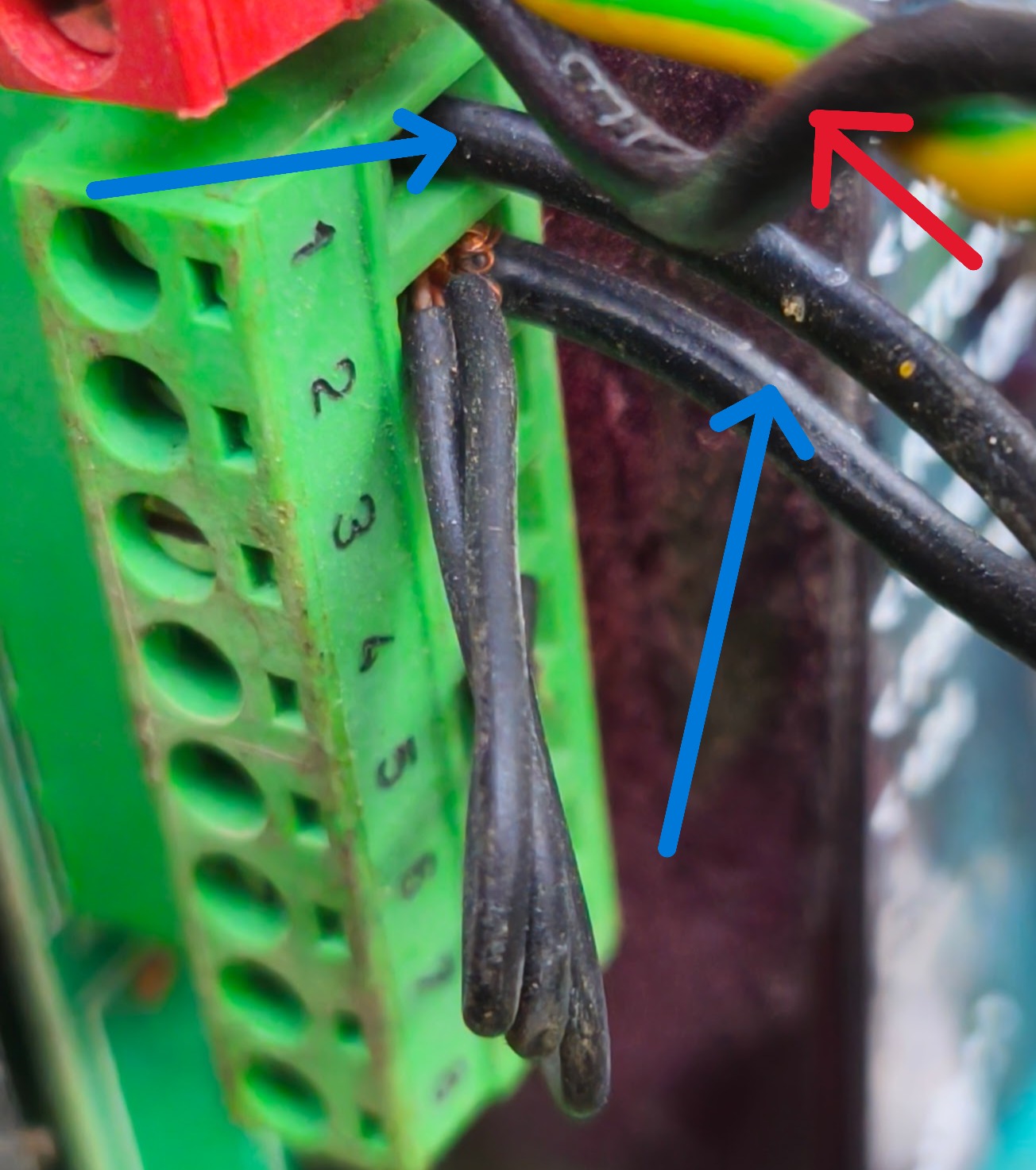 Merci pour votre cordialité. Les fils marqués d’une fleche bleue sont dans la même gaine qu’une alimentation de photo cellule et arrivent donc au pied du poteau ou se trouve la dite photo cellule, facc xp15w.