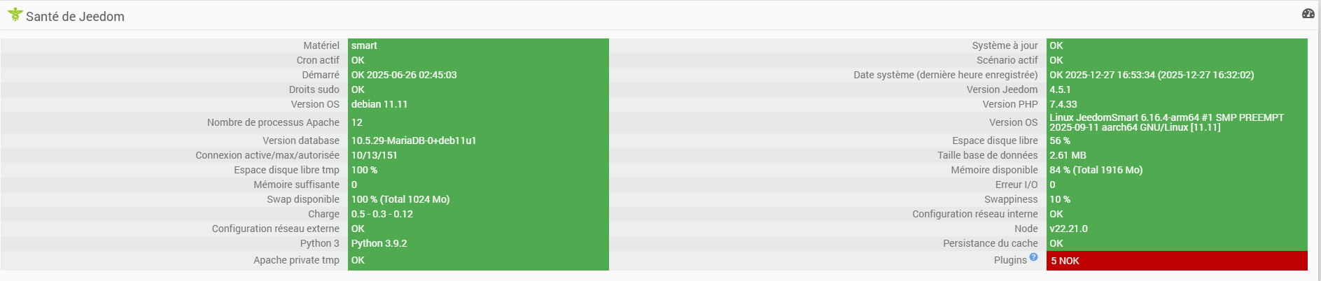 Ben au vu de la page santé qui dit que tu ton jeedom à démarré le 26/06/2025 soit ça n’a pas marché, soit il à eu le même souci en redémarrant …