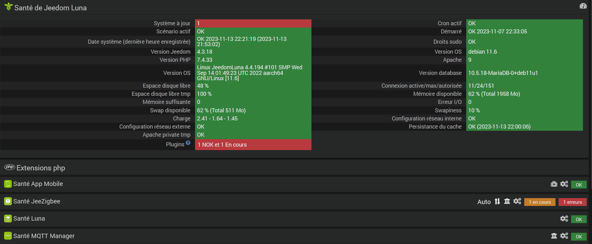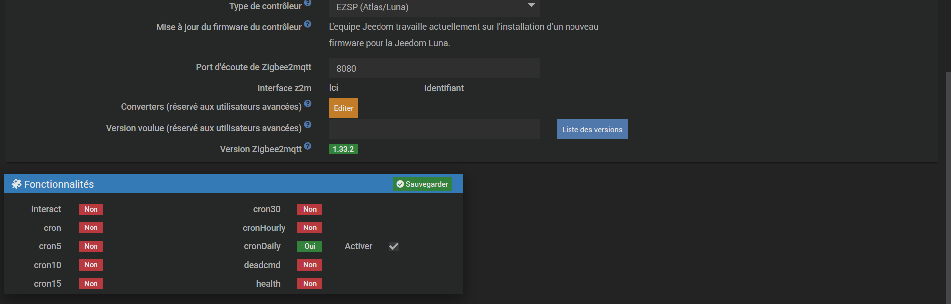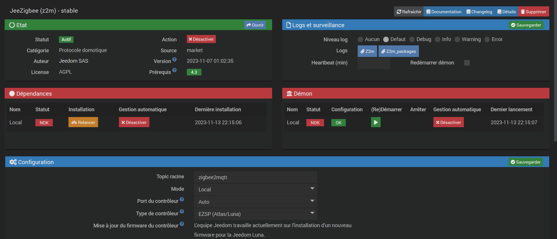 Sur Jeezigbee, Démon OK, dépendance NOK, et une seule fonctionnalité est oui (cronDaily). De plus, la relance de l’installation ne fonctionne pas. Je ne sais que faire, par quoi commencer.