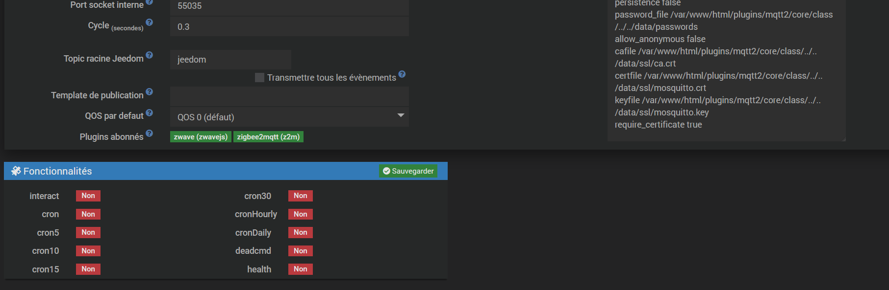 Si je prends MQTTmanager, statut actif, dépendance OK, démon OK mais toutes les fonctionnalités sont non…