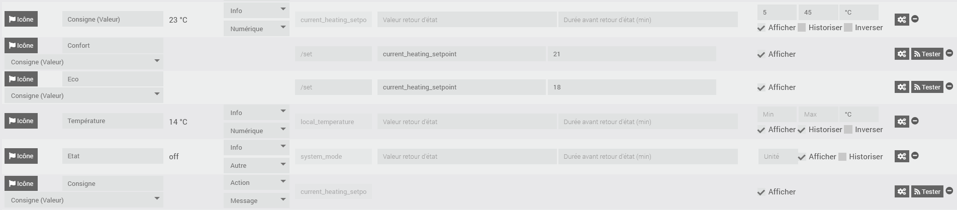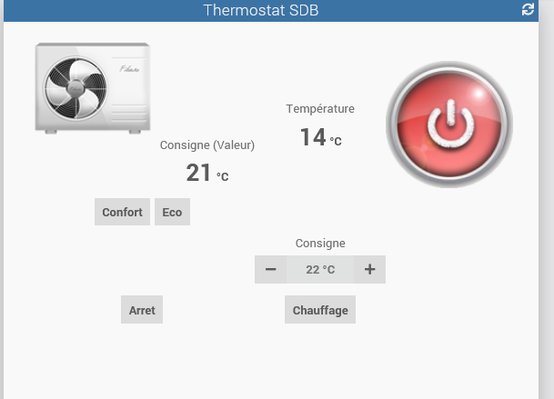 Mon seul problème est que je ne peux pas envoyer une nouvelle consigne au thermostat avec une commande de type slider/curseur. Je suis obligé de configurer cette commande en type message et de saisir la valeur de la consigne souhaitée dans le champ « message ».
