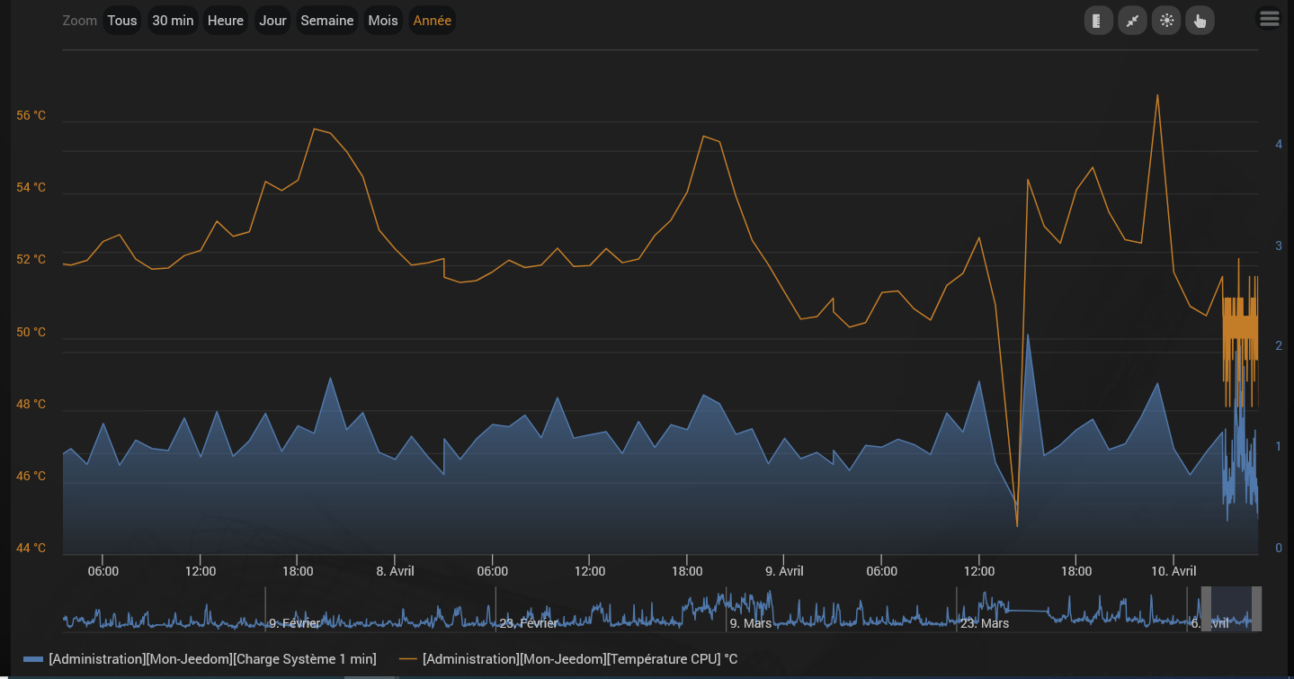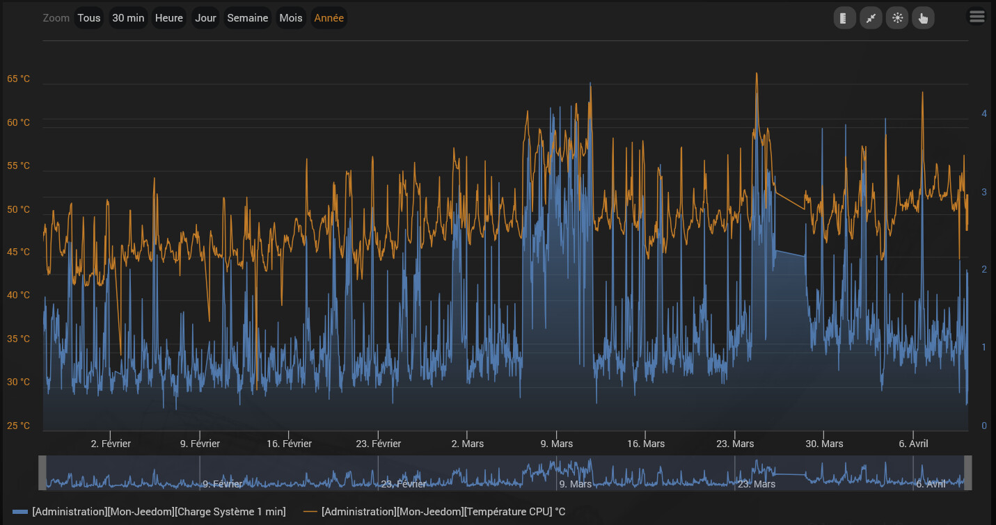 J’avais des pics de températures à 65 °C lors des pic de CPU à 5 et moyenne à 2.
