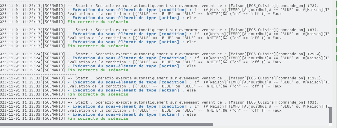 Bonjour, je rencontre un problème pour le déclenchement d’un scénario : afin d’activer un contacteur selon des valeurs de puissance renvoyé par un shelly, j’ai crée un virtuel avec 2 commandes infos et 2 actions sur valeur du type « si X>PWatt pendant 2mn–>démarrer scénario » ; dans la page du scénario, j’ai choisi comme déclencheur le virtuel que j’ai crée ainsi que la commande correspondante mais dans les logs, je m’aperçois que le scénario démarre toutes les 5 sec…