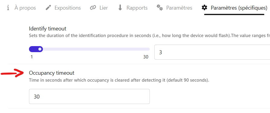 En le réglant sur 30 secondes, lorsque l’on quitte le détecteur, l’indication de présence retombe après 30 secondes, … mais: si on reste devant le capteur à bouger dans tous les sens pour forcer une détection continue, l’indication de présence tombe aussi après 30 secondes alors que l’on est toujours devant le capteur.