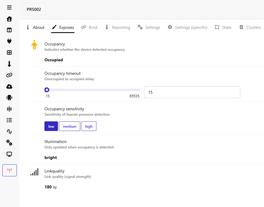 30 secondes plus tard (délai réglé dans le paramètre) sur le dashboard on voit l’indication présence retomber à 0, et dans le log Z2M: