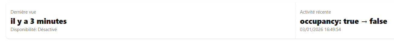 Quand on détecte une présence, sur le dashboard on voit l’indication présence s’activer et la date du dernier message: