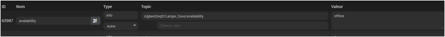 avec zigbee2mqtt on a accès à l’état de disponibilité d’un équipement avec cette commande de type « autre » qui peut prendre deux valeurs ‹ online › ou ‹ offline › :
