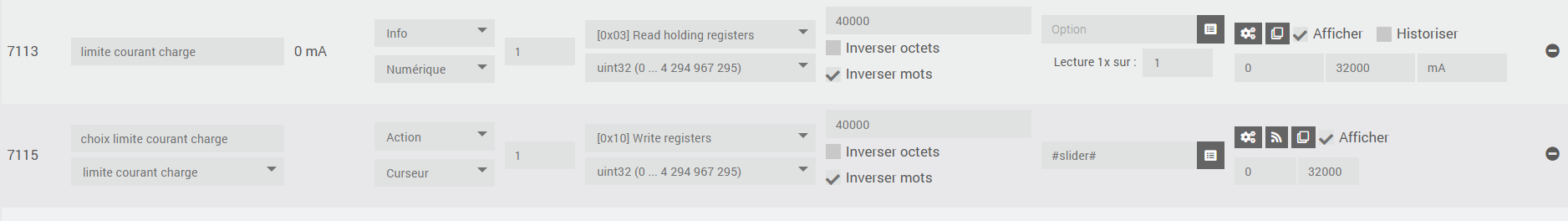 j’ai redemarer la borne , modifier les reglages modbus sur l’interface de la borne mais rien n’y fait. j’ai bien la remontée de toutes les informations de la borne.