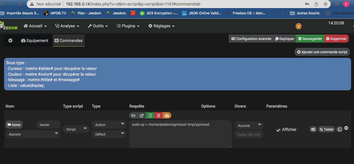 je débute avec Jeedom, pourrais-tu développer la méthode ? Cela fait plusieurs jours que je lis et relis tous les messages et je fais des essais qui ne mènent à rien… J’ai fait l’installation des paquets en ssh, c’est ensuite que cela se gâte… j’ai copier les lignes dans le plugin script avec mes infos sans trop savoir si tout était correcte et lancer la commande en ssh…