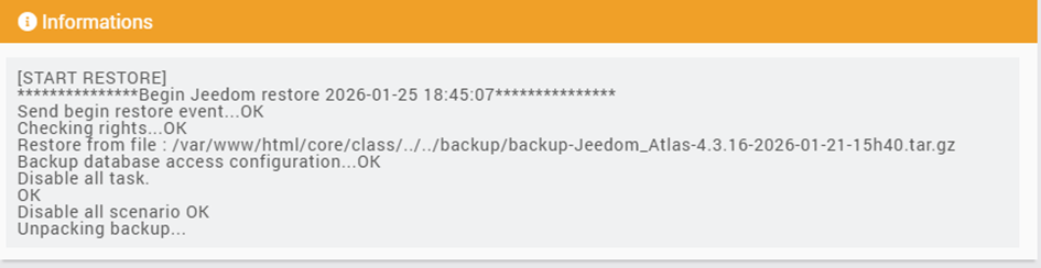 Etant avant la migration en 4.3.16, Debian 10 et Zigbee, fait effectuer une sauvegarde (backup-Jeedom_Atlas-4.3.16-2026-01-21-15h40.tar.gz)