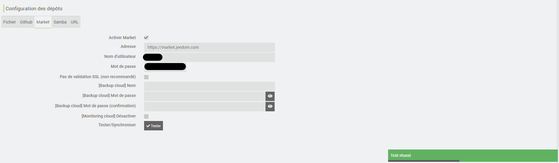 Et le test vers le market (accessible depuis :Réglages > Systemes > Configuration : Onglet « Mises à jour/Market », me dit que tout est ok: