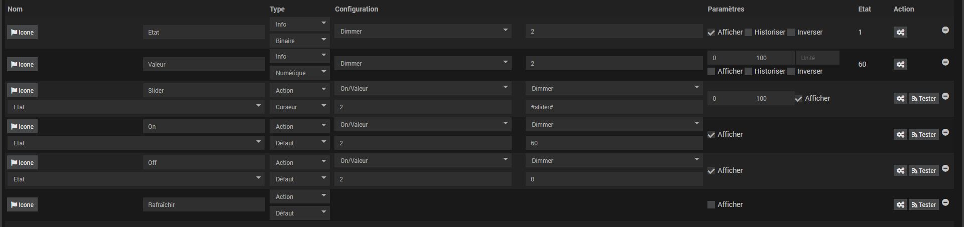Par contre, comme indiqué ci-avant, dans Jeedom, lorsque j’allume ou j’éteins la lumière du bureau, l’état de la lumière de la chambre passe à 0 avant de repasser à la valeur indiquée pour le dimmer (valeur allumée)…