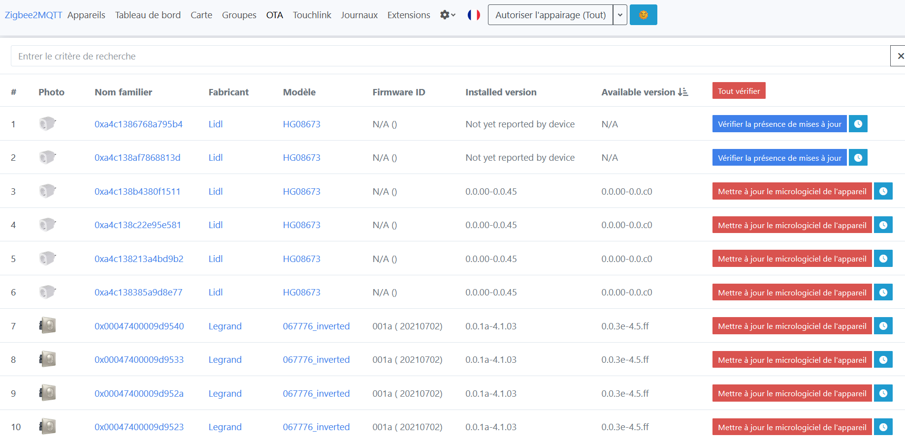 Il était enfin possible de faire la mise à jour du firmware de mes inter volets Legrand depuis la page de gestion Zigbee2mqtt.