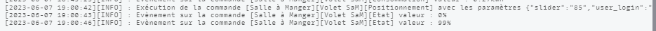 [2023-06-07 18:35:16]INFO : Exécution de la commande [Salle à Manger][Volet SaM][Positionnement] avec les paramètres {« slider »:« 31 »,« user_login »:"…}