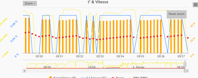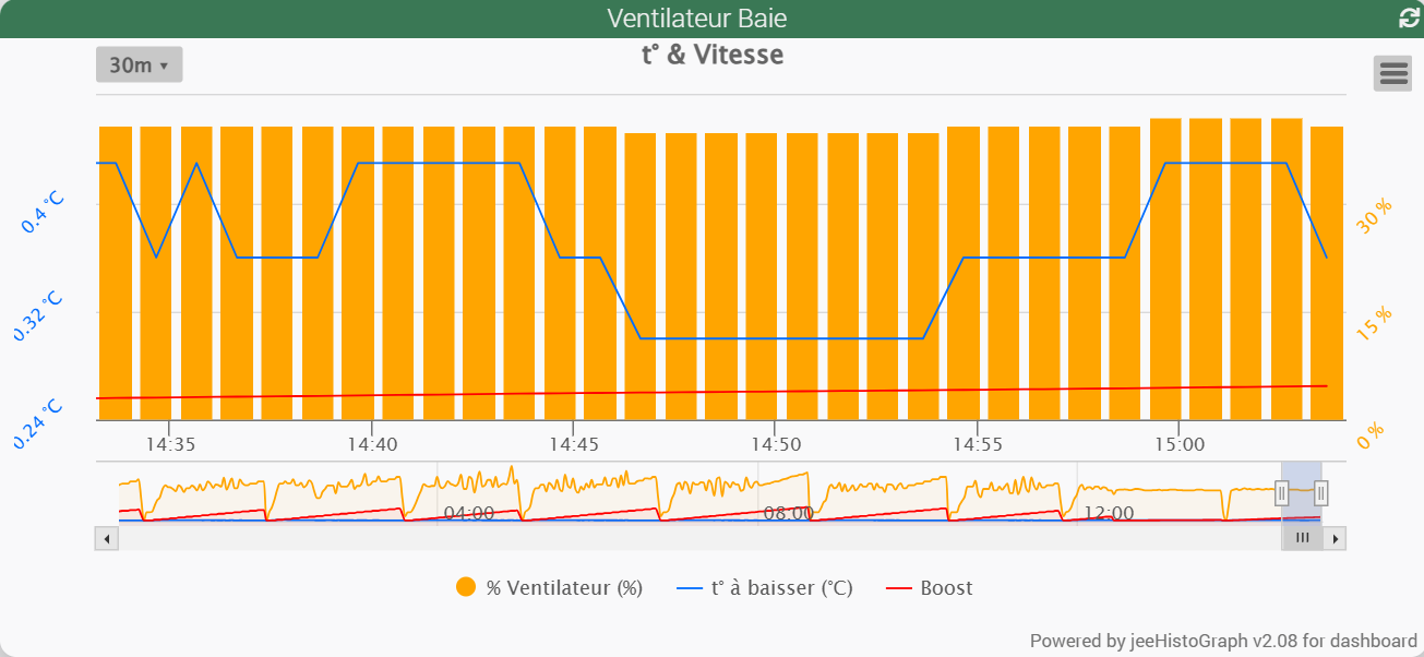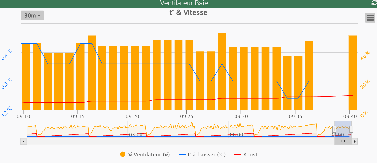 Le graph ci-dessous à 3 nouvelles valeurs (t°, % ventilo et boost), le rafraichissement se fait toutes les minutes (même message MQTT),