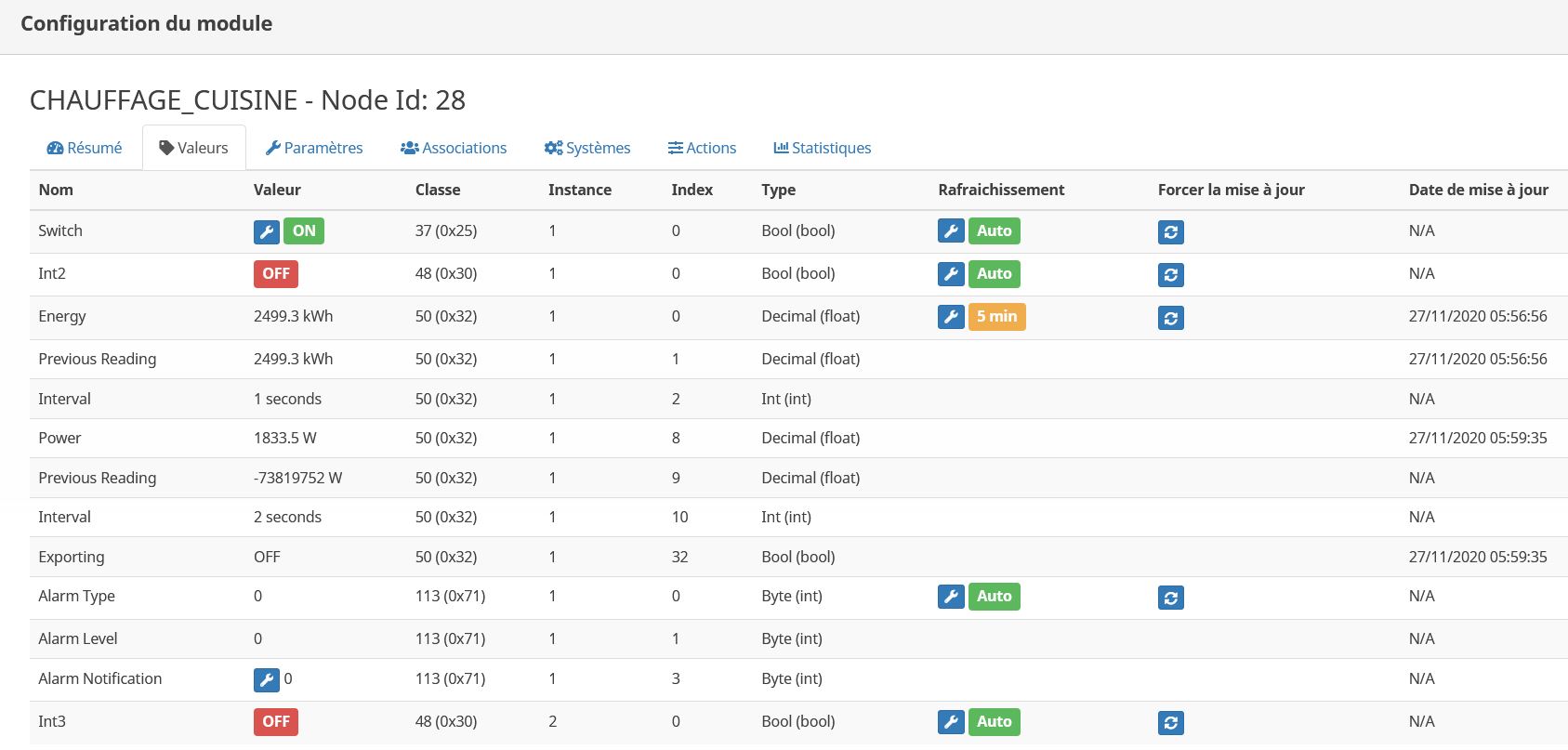 Dans la partie configuration, j’ai paramétré « Energy » (qui correspond à la consommation totale en KwH) en rafraichissement tous les 5 minutes au lieu de AUTO (j’avais lu qu’il fallait mieux le paramétrer comme ça pour que la remonté d’info se fasse bien).