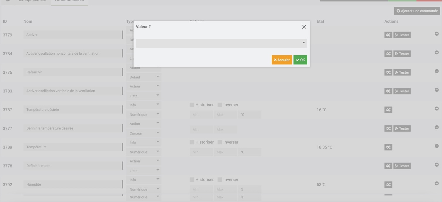 Le panneau de commande ou j’utilise les boutons « Tester » qui me retourne des valeurs vides pour « Activer oscillation horizontale de la ventilation » et « Définir le vitesse de ventilation »